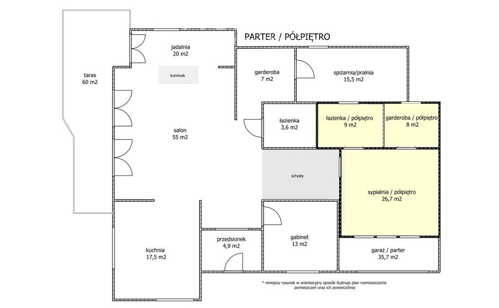 Na parterze znajduje się reprezentacyjny salon z marmurowym kominkiem